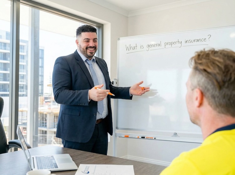 Contractor Cover explaining something to a contractor with "What is general property insurance?" written on a whiteboard